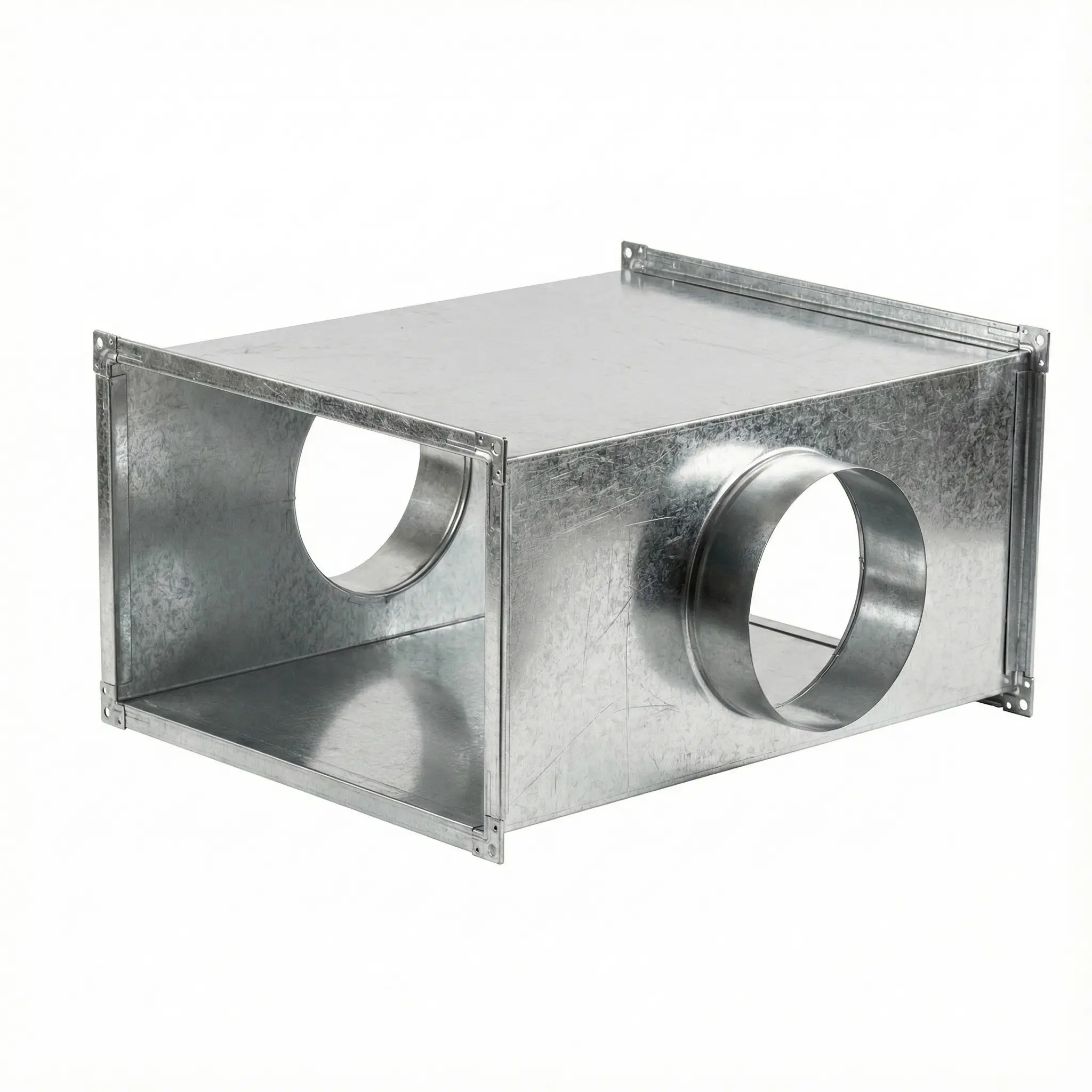 Конструктивно крестовина представляет собой основной прямоугольный участок, по сторонам которого выполнены две круглые врезки. В результате формируются четыре выходных патрубка: два прямоугольных и два круглых. Такая конфигурация позволяет объединить каналы различного сечения без применения дополнительных переходов.